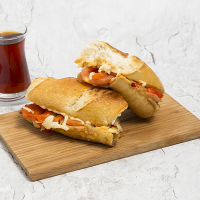 Seçeceğiniz özel baget ekmek içinde, uzun pişirilmiş yumuşak kuzu kokoreç, beyaz soğan sote, fırınlanmış domates dilimleri, köz biber turşusu, mozarella peyniri ve dynamite soslu Küba sandviç tosu