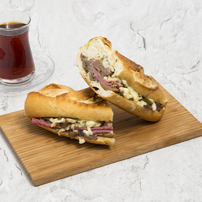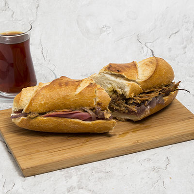 Seçeceğiniz özel baget ekmek içinde, uzun pişirilmiş dana kavurma, dana jambon, sarımsaklı mantar sote, karamelize kırmızı soğan, çubuk salatalık turşusu, mozarella peyniri ve blue cheese soslu Küba sandviç tostu